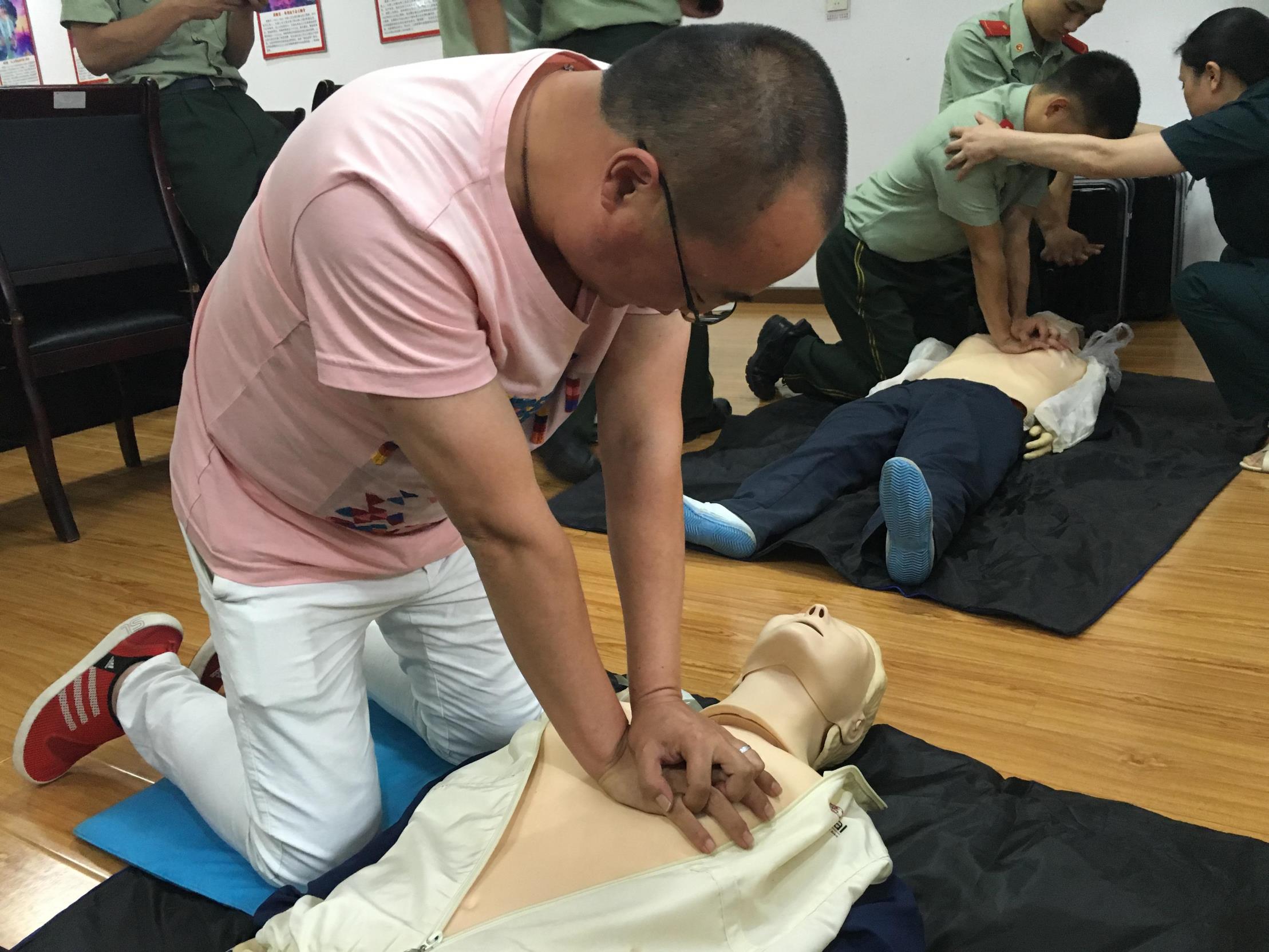 此次培訓(xùn)邀荊門市紅十字會工作人員就基本應(yīng)急救護(hù)知識進(jìn)行專業(yè)講解。培訓(xùn)現(xiàn)場采取用假人進(jìn)行模擬教學(xué),講師就心肺復(fù)蘇、創(chuàng)傷急救、止血等常見病害的救護(hù)前癥狀判定、實際救護(hù)方法及注意事項、救護(hù)成功的反應(yīng),尤其對尋找心肺復(fù)蘇的按壓點、按壓手勢方法、按壓頻率以及人工呼吸的注意事項進(jìn)行了詳細(xì)講解。培訓(xùn)現(xiàn)場氣氛輕松活躍,參訓(xùn)人員紛紛參與實際操作,對假人進(jìn)行按壓、人工呼吸等救援操作。