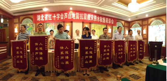 6月3日,湖北省紅十字會(huì)蘆山地震抗震救災(zāi)供水救援表彰會(huì)在武漢召開。表彰會(huì)上,荊門市供水總公司黨委書記陳永根作典型發(fā)言,荊門市供水總公司被授“情系蘆山 人道博愛”錦旗,參與供水救援的隊(duì)員彭華、黃洋獲得嘉獎(jiǎng),榮獲廬山地震抗震救災(zāi)先進(jìn)個(gè)人稱號(hào)。