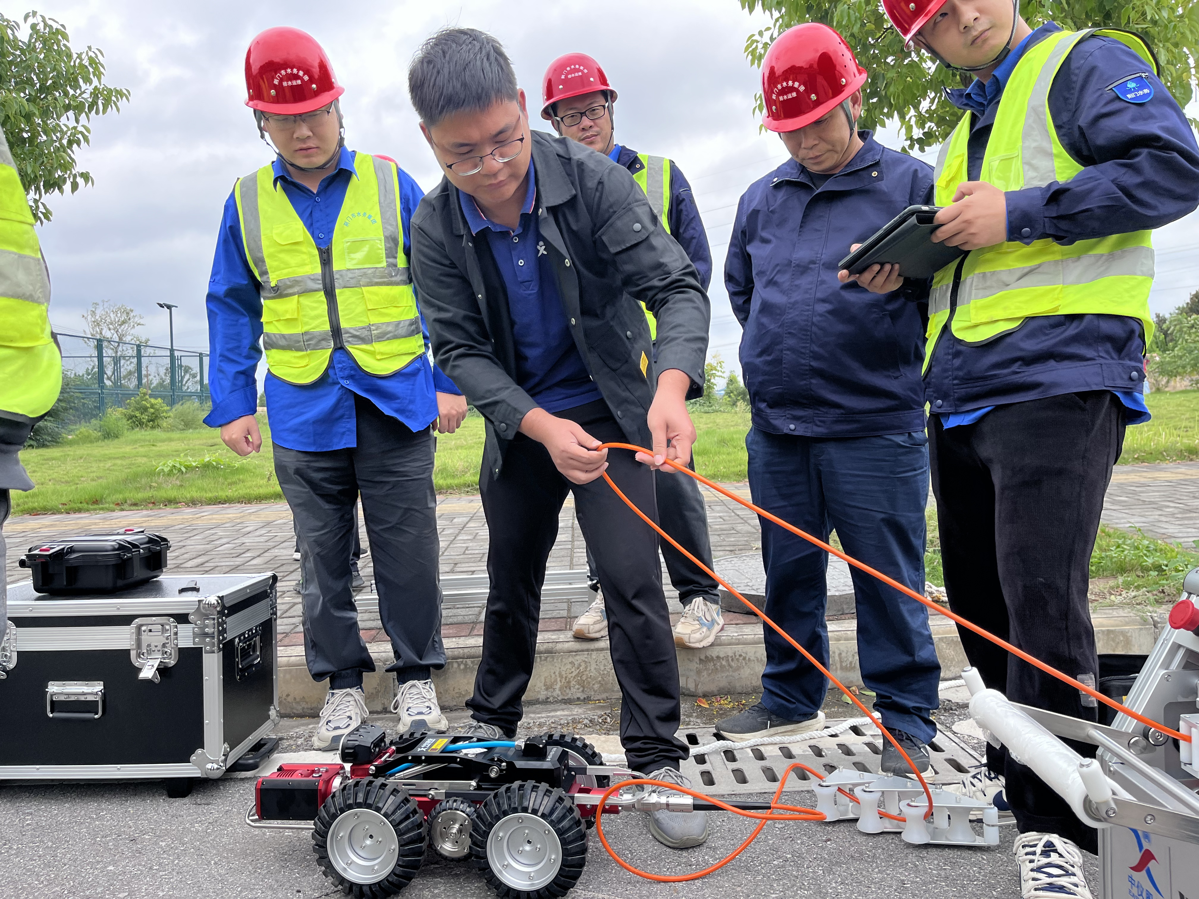 隨后,實戰(zhàn)演練正式拉開帷幕。在管道排查現(xiàn)場,參訓學員分組實操,授課老師全程跟蹤指導,及時糾錯,確保每位員工都能熟練掌握機器人的使用技巧。隨著機器人在管道內(nèi)靈活穿梭,高清畫面實時傳輸至控制終端,管道內(nèi)部的每一處細節(jié)都清晰可見。大家一邊操作,一邊根據(jù)畫面反饋調(diào)整機器人姿態(tài),精準捕捉管道裂口、錯口、沉降等故障點。