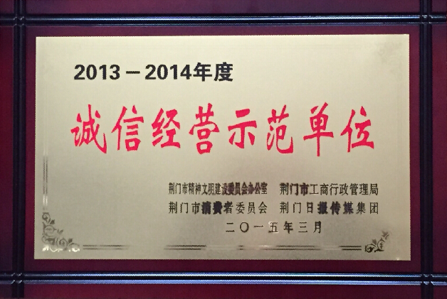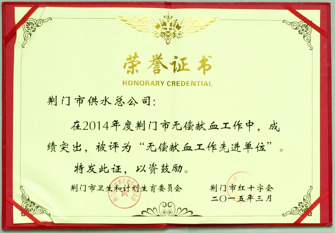 近日,市供水總公司先后被市文明辦、市工商局、市消協(xié)評為荊門市2013——2014年度“誠信經(jīng)營示范單位”;被市衛(wèi)計委、市紅十字會評為“2014年荊門市無償獻血工作先進單位”。