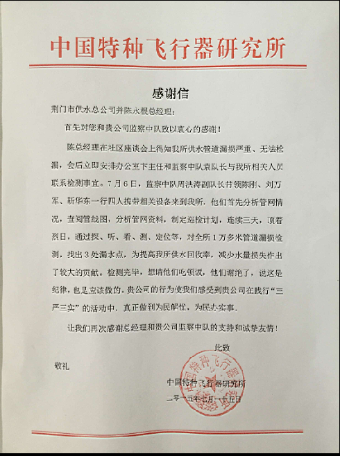 7月28日,605所相關(guān)負(fù)責(zé)人一行2人專程到公司送上“全心全意服務(wù)企業(yè)”錦旗和一封感謝信,表達(dá)公司免費(fèi)為其探測(cè)漏、減少其水量損失的謝意。