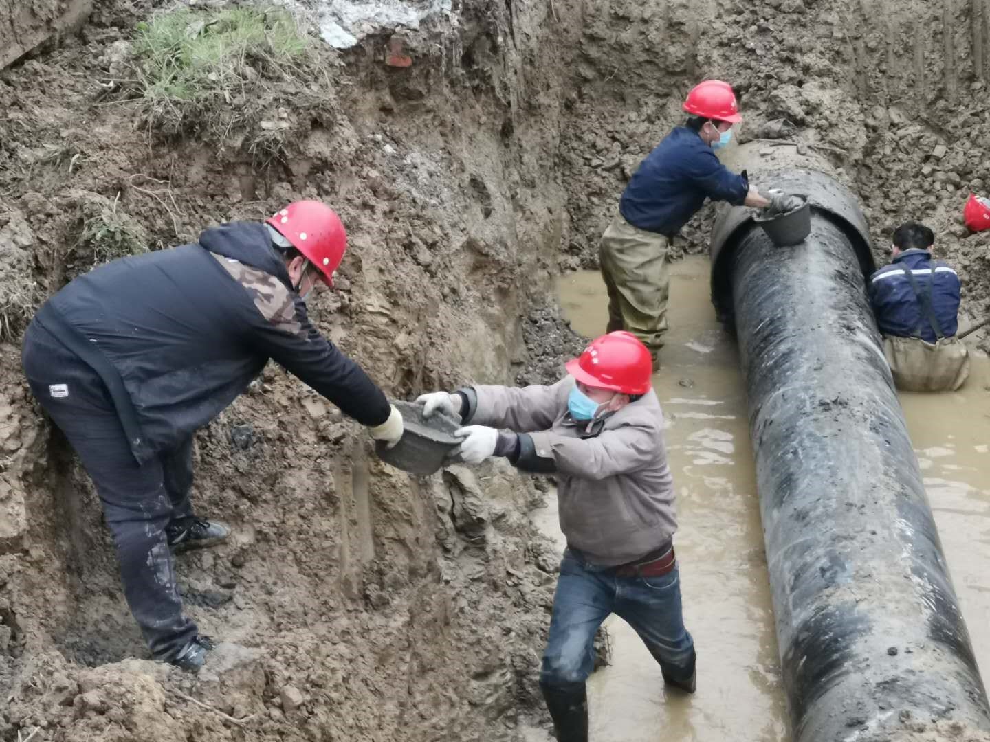 2月23日10時,掇刀區(qū)迎春大道人福藥業(yè)門前DN600mm主供水管道突發(fā)爆管,供水維修部門迅速啟動疫情期間應急搶修預案,組織人員、工程機械、維修設備趕赴現(xiàn)場,經過9個多小時的緊張搶修,于當日晚7點42分恢復了供水。緊接著次日8點,東寶區(qū)科陽路DN600mm主供水管道突發(fā)爆管,巡查人員現(xiàn)場核實后迅速止水,并及時通告用戶停水信息后開始倒閘排水,到13時左右開挖出爆管的DN600的主供水管道出現(xiàn)在大家面前,相比前日的搶修,整段水管因裂口較大損壞嚴重,不能簡單修復,只能現(xiàn)場立即制定可靠的管道更換維修方案。當時,全部工作人員從早上到現(xiàn)場已經工作了5個小時,滴水未進,但大家為保障搶修進度,仍然堅持一邊加班加點對基坑進行處理,一鼓作氣將破損管道清理出來,做好對接管道的清淤工作。另一邊搬運快干水泥,切割、加工、運輸、吊裝管道,14點35分把全部材料物資運抵現(xiàn)場開始作業(yè)。隨后,大家在泥地里匆匆啃了幾口方便面后,又投入到緊張的搶修工作中,終于在18點17分完成了維修,待水泥養(yǎng)護好后,于21點27分通水,及時保障了科陽路企業(yè)和周邊居民的正常生產生活用水。