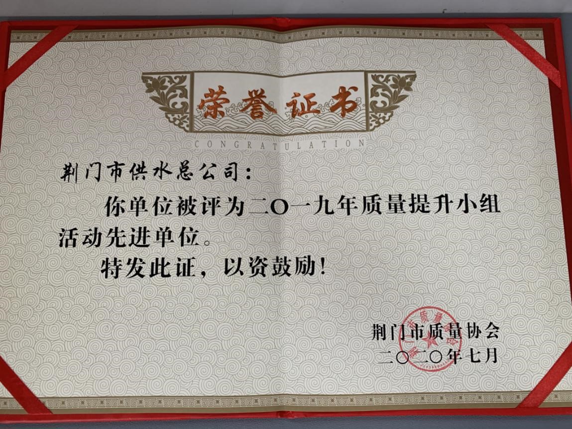 716日,荊門(mén)市第十五次質(zhì)量提升小組代表會(huì)議召開(kāi)。會(huì)上,市供水總公司被評(píng)為2019年質(zhì)量提升小組活動(dòng)先進(jìn)單位,其中發(fā)布的“縮短掇刀中壓區(qū)停水時(shí)間”和“提高廠站出水水質(zhì)”兩項(xiàng)QC成果獲一等獎(jiǎng),“提高廠站設(shè)備巡查時(shí)實(shí)率”QC成果獲二等獎(jiǎng),公司黨委委員、副總經(jīng)理被評(píng)為卓越領(lǐng)導(dǎo)者,生產(chǎn)安全部經(jīng)理劉昕平被評(píng)為優(yōu)秀推進(jìn)者。
