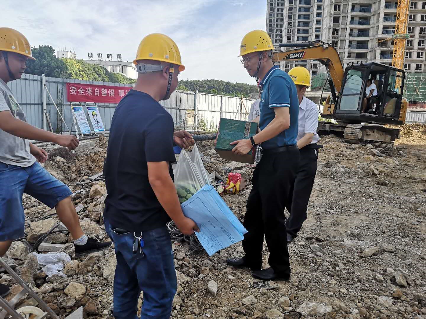 炎炎夏日,驕陽似火。連日來我市高溫黃色預警信號持續(xù)拉響,這給在建給排水工程項目施工和供水生產(chǎn)帶來諸多不便和困難。為切實做好防暑降溫工作,確保夏季高溫安全生產(chǎn),8月7日上午,市供水總公司黨委書記、總經(jīng)理陳永根帶領公司黨委班子成員,分別到“誠愛佳苑”戶表安裝項目、長興大道管網(wǎng)改造工程等在建施工工地現(xiàn)場,慰問在高溫酷暑中堅守崗位、辛勤勞動的一線工人,為他們帶去西瓜、礦泉水等防暑降溫物品。