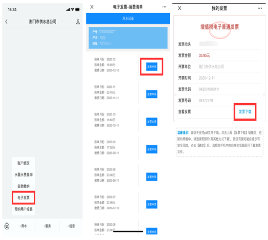 用戶在繳費(fèi)成功后,只需關(guān)注“荊門市供水總公司”微信公眾號(hào)或登錄網(wǎng)上營(yíng)業(yè)廳,進(jìn)入電子發(fā)票模塊,即可查詢、申領(lǐng)、下載打印水費(fèi)電子發(fā)票。目前,電子發(fā)票系統(tǒng)運(yùn)行平穩(wěn)順利。