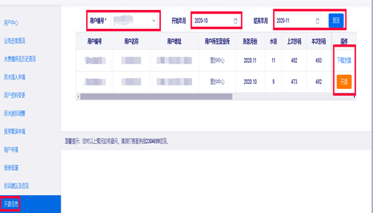 3.點(diǎn)擊“開票信息”選擇“用戶編號(hào)”,選擇月份,點(diǎn)擊“查詢”,點(diǎn)擊“開票”,點(diǎn)擊“發(fā)票下載”。